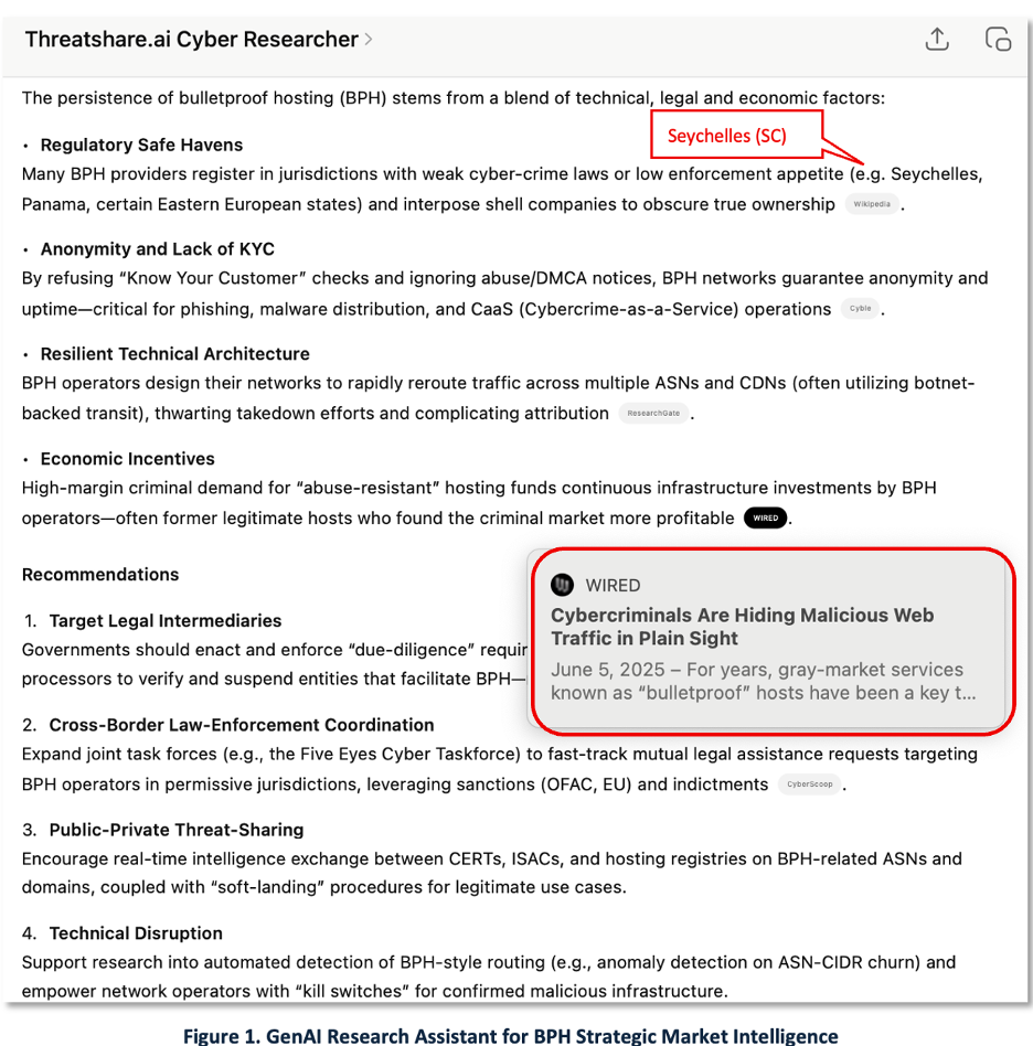 Our scenario starts with an analyst doing basic research on BPH using GenAI in support of an international law enforcement investigation. In Figure 1 we see a BPH overview report generated using our ‘ThreatShare.ai Cyber Researcher’ implementation of ChatGPT tailored for the cybersecurity domain. As highlighted, the analyst was intrigued by the Seychelles mention and the BPH report from Wired.