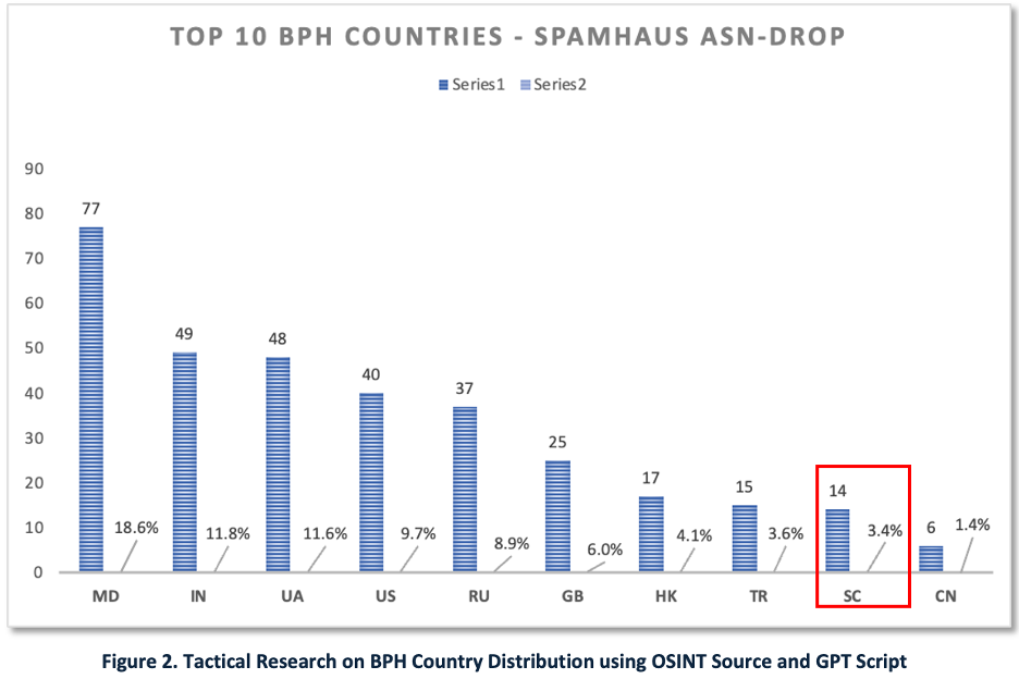 This lead tipped the analyst to pivot to OSINT, using the Spamhaus – ASN-Drop feed of 400+ ASNs tied to cybercrime/BPH. The analyst downloads the JSON, prompts GenAI to convert to CSV, and charts results in Excel (Figure 2). Seychelles (SC) appears among top BPH-linked ASNs; several top-10 countries align with “regulatory safe haven” patterns from Figure 1.