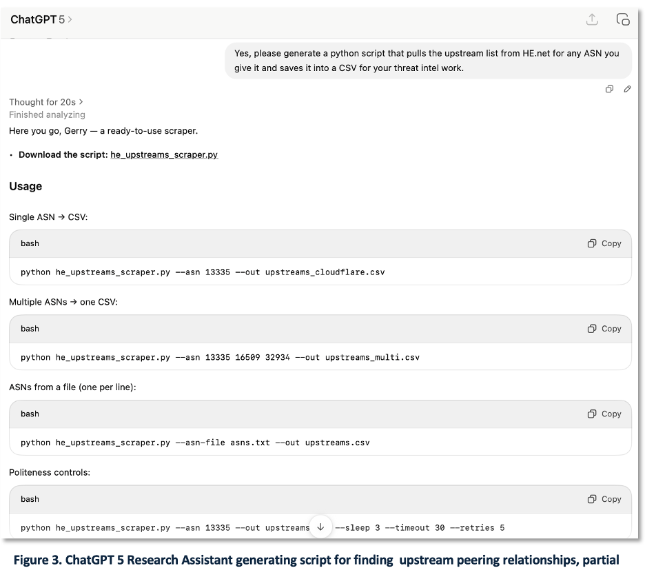 Continuing with the scenario, the analyst asks GenAI to draft Python that automates ASN lookups and enrichment (Figure 3). If feasible, engineering can wrap this into an agent to streamline future cases.