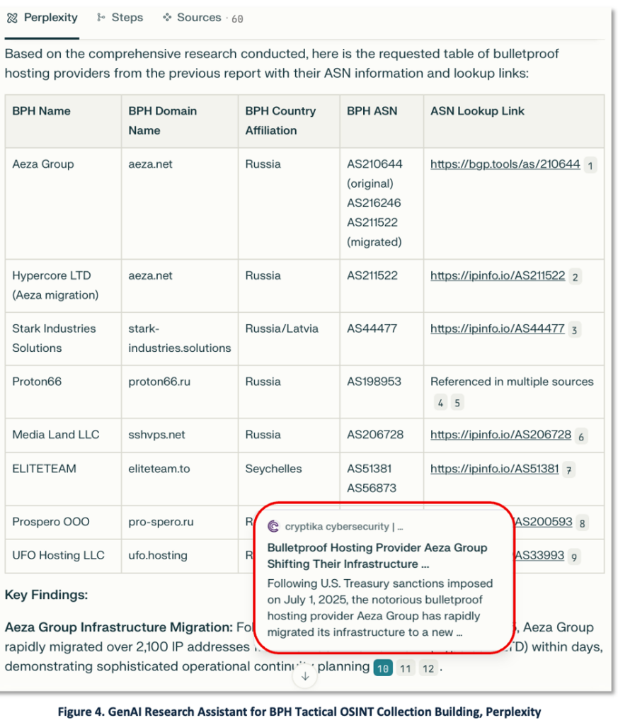 To complete the scenario, the analyst builds a working catalog. The analyst prompts GenAI to assemble a BPH collection (name, domain, country, ASN, lookup reference) – see Figure 4 (Perplexity output).