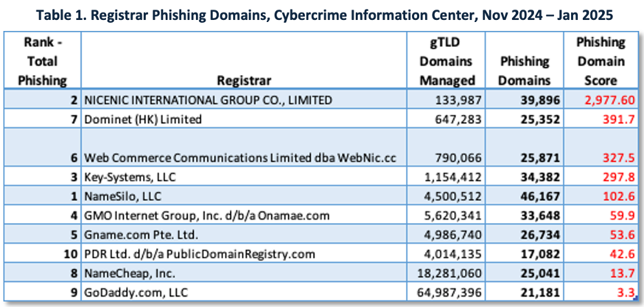 Cyber threat actors gravitate towards domain registrars with lax oversight. Table 1 ranks registrars by phishing-domain risk (Cybercrime Information Center).